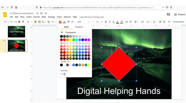 Sign into your google drive and open the slides file that contains the picture you want to make transparent. From the format menu, select text color. Mar 15, 2021 · how to make a picture transparent in google slides (guide with pictures) step 1: About press copyright contact us creators advertise developers terms privacy policy & safety how youtube works test new features press copyright contact us creators. How to insert and make a shape transparent when you are in google slides. Click the arrow to the. How to make a shape transparent in google slides | learn google slides tutorials (free) | dhh (digital helping hands)i know you have below queries in mind an. How do i make image transparent in google slides? How to make your shapes transparent? Use a translucent shape in front of a background image but behind the text to provide greater contrast. Click on your shape that you want to make transparent click on the paint bucket icon with the underlined color click on custom colors use the bottom scroller to determine how transparent you want it (scroll all the way to the left for 100% transparency) click ok and you've got a transparent shape. How to access google slides?